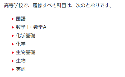 なお、日赤広島看護大の入試情報サイトには、入試科目に含まれなくても「化学」「化学基礎」「生物」「生物基礎」は「履修すべき科目」と明記されています。これは入学後の学習に必須だからでしょう。